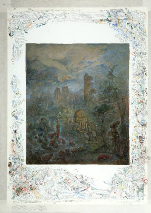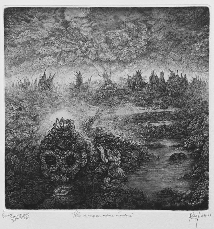Dans ce chef-d’œuvre ahurissant englobant sa vie, ses amours, ses amitiés, ses penchants et construit comme un pont entre sa gravure et sa peinture, l’artiste réalise son entreprise majeure : un paysage devenant conte, l’épique panorama de sa vie où le spectateur halluciné prend l’ampleur d’un travail artistique avec son infinité copulatoire. Oui, Georges Rubel est un mélangiste ! Il prône la caresse de l’œil, le toucher sensible du papier-peau, la légère douleur où le point du jour flétrit la nuit.