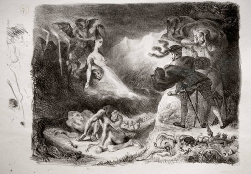 Comment ne pas penser également à L’Ombre de Marguerite apparaissant à Faust, d’Eugène Delacroix. Le dernier personnage en haut à droite de la peinture de Georges Rubel rappelant étrangement Faust devenu presque épouvantail rachitique face à Marguerite, transformée en monolithe.