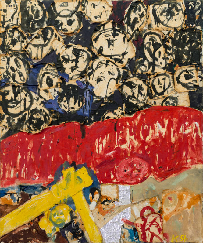 Dès le premier coup d’œil, on est agressé. C’est une image brutale constituée de trois bandes, noire, rouge, jaune, disposées l’une sur l’autre à l’horizontale, comme un drapeau allemand, donc une image brutale. Mais au premier coup d’œil on ne comprend pas bien de quoi il s’agit en dehors de l’agressivité flagrante parce qu’il faut dire aussi que c’est tout bouillonnant. Un drapeau allemand bouillonnant c’est troublant et ce n’est pas rassurant. La bande noire qui occupe en fait à peu près la moitié de la composition n’est pas uniformément noire. Elle est constituée d’une trentaine de ronds, pas réguliers du tout et de tailles très différentes, d’un blanc cassé zébré et tacheté, haché même, d’un noir tout dégoulinant, qui font immédiatement penser à des tronches rigolardes et hurlantes. Deux de ces ronds sont entourés de bleu, ou plutôt sont peints sur un morceau de tissu bleu collé sur la toile, et les autres sont maladroitement cerclés de beige pour bien les distinguer de leurs voisins, pour partie tissus peints collés aussi. Il s’agit donc d’un noir sacrément composite, grouillant, et qui fait vraiment sale. C’est le noir qui prédomine, le noir du drapeau allemand mais composite et crasseux, qui donne la note vraiment hostile de la toile. Juste en dessous, une bande assez large, un quart de la composition environ, toute rouge sang et dégoulinante, elle aussi, un peu comme une banderole de manif fraîchement peinte et que l’on déploierait avant qu’elle n’ait totalement séché. La bande du bas est étrange car elle paraît être beaucoup plus tranquille par rapport au reste. Sa partie gauche est occupée principalement par une espèce d’équerre jaune, la pointe dirigée vers le haut, avec entre ses deux bras une sorte de tête ahurie, toute ronde et à barbe rousse, qui fixe le spectateur les yeux ouverts, tout ronds eux aussi. Juste à côté, comme si elle jaillissait de l’équerre le bras tendu, une forme pas bien déterminée, peut-être un homme torse-nu. On pourrait deviner une sorte de tête rousse aussi, avec dans la chevelure un trait noir, qui semble très résolue à suivre le bras tendu, ou qui fait de gros efforts pour tirer l’équerre, c’est-à-dire pour aller de l’avant, c’est-à-dire pour se diriger vers la droite de la toile, avec un bout de papier aluminium collé comme une feuille d’or qui semble sur le point de l’envelopper, et puis devant le papier alu un drôle de petit personnage transparent, au contour rouge sang avec une auréole rouge également, qui semble ouvrir le chemin fait d’un mélange de terre et de sable, donc composite également. Pour cette partie la dominante de couleur est donnée par l’équerre, le jaune. Il y a une disproportion considérable entre les énormes têtes à dominante noire du haut, et les petits personnages à formes imprécises, presque indiscernables, qui se trouvent sous ou à côté de l’équerre, et à dominante jaune du bas. Succession de couches, noire, rouge, jaune, le drapeau allemand. Sur la banderole rouge du centre, il y a un petit cercle vraiment rouge figurant probablement une tête, et au-dessus, écrit en blanc cassé « VERONICA », mais pas nette du tout, à peine lisible comme si la banderole pas sèche avait dégouliné dessus. On se croirait presque dans un stade pour une compétition sportive, les spectateurs hurleurs cantonnés derrière une barrière métallique, comme celles qui agrémentent depuis des décennies tous les paysages urbains d’Europe et qui canalisent les citadins et citoyens, enthousiastes ou en colère, sur laquelle on aurait collé une affiche publicitaire pour promouvoir la marque « VERONICA » avec une tête radieuse et toute rouge dessus, un stade allemand, à Nuremberg ou à Berlin, ou s’offriraient « Les dieux du stade » à la contemplation de tous. Mais ici l’événement est particulièrement tragique car il s’agit de l’épilogue d’une histoire qui va laisser des traces très profondes dans la mémoire du Monde, ou peut-être de deux histoires, celle de la chrétienté et celle d’Allemagne.