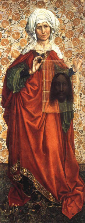 Se présente alors à mon esprit l’image d’une dame d’un certain âge, le regard grave et un peu perdu au milieu d’un visage légèrement froissé, tenant avec une extrême délicatesse et du bout des doigts, entre le pouce et l’index de chaque main très exactement, non pas devant elle mais un petit peu sur son côté gauche, un mouchoir de tulle très fin et transparent sur lequel se dessine le visage noiraud et tout à fait inexpressif d’un homme jeune aux cheveux longs et moussus. C’est Véronique mais pas la petite pauvresse du cartouche de Jean Fouquet ni la frêle jeune fille de Martin Schongauer, notre Véronique introductive. Oh non ! Celle-ci est très richement vêtue. Une espèce de turban blanc comme l’autre, pour souligner l’orientalité bien sûr, mais traversé de fils d’or et recouvert d’un voile également de tulle noué large sur son cou un peu sec, un ample manteau de pourpre parementé d’or et de grosses pierreries par les échancrures duquel dépassent les manches globuleuses d’une robe de soie verte. La Véronique de Flemalle piétine un épais tapis de fougères courtes, de pissenlits et de muguet, et sa silhouette se détache sur une tenture de brocart à motif de feuilles en volutes et d’oiseaux battant des ailes. Un espace totalement fermé mais raffiné et précieux. Sur le mouchoir, hypostase sans doute mais pas périchorèse, l’esprit saint ne paraissant pas habiter les yeux du jeune homme, même s’il peut, pour certains, ressembler fortement à son père. Il y a dans cette image plutôt terne du « fils de l’Homme » du Bertillon avant la lettre. Donc, pas de perspective ni dans la scène ni dans le regard, tout du moins dans celui du Christ impassible, car pour Robert Campin, le premier grand peintre d’Europe du nord, la maîtrise de la perspective n’est pas vraiment une préoccupation, à l’inverse des Italiens de son temps et surtout des Renaissants des temps futurs... Mais Campin, c’est un homme bien inséré dans son époque. Il est plutôt impliqué et réactif quand on connaît un peu le déroulé de son existence politiquement et sexuellement aventureuse. Pas plus que Fouquet il n’est le peintre de la vie moderne (comment pourrait-on être moderne en illustrant l’aliénation religieuse ?) mais tout comme lui il va puiser des éléments dans son environnement, dans sa contemporanéité, et il n’a pas nécessairement besoin de l’artefact d’une auréole pour désigner le sacré...