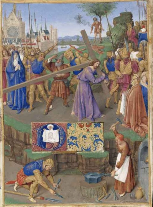 Le presque carré du portement de croix, tout peuplé et effervescent qu’il est, ne représente qu’à peu près les deux tiers de la feuille. Le tiers restant est le théâtre d’une scène bien étrange. En bas d’une modeste falaise, modeste mais escarpée quand même, dans une sorte de ravin, il y a une femme, avec un air méchant et obstiné, portant une robe rouge et par-dessus un tablier blanc qui n’est pas sans rappeler le tissu de Véronique, qui martèle sauvagement un pauvre morceau de ferraille qu’elle tient avec une pince. Son bras au bout duquel il y a le marteau est levé tout droit au-dessus de sa tête et on ressent au plus profond de soi, on anticipe, le moment où il va s’abattre avec fracas sur la ferraille posée sur une petite enclume elle-même posée sur un gros billot de bois. Au pied du billot, il y a quelques outils, des marteaux de rechange et une autre pince, avec un peu plus loin une cruche en terre et un verre car c’est bien connu le travail donne soif, d’autant plus que derrière la femme il y a un four un peu noirci et un foyer où sont entrain de chauffer quelques morceaux de métal. A gauche un soudard, un genou en terre et qui a déposé près de lui sa pertuisane, ramasse avec une certaine avidité deux ferrailles pointues, les clous qui seront utilisés à la crucifixion. On pourra faire remarquer que pour ce labeur ils s’y prennent un peu tard mais ils y mettent de l’ardeur. Il est dit que la femme-forgeron c’est Hédroit, un personnage de pure fiction, tout autant que les autres en fait, qui apparaissait dans les mystères théâtraux donnés sur les parvis des églises ou sur les places des villes... On retrouvera Hédroit dans une autre enluminure des « Heures Chevalier »l, L’Arrestation de Jésus, où, au tout petit matin, elle tient une lanterne pour que les soldats ne se trompent pas d’homme. C’est donc une femme fondamentalement mauvaise qui veut en finir d’avec le divin ou tout du moins d’avec son représentant, un démon femelle, un succube, beaucoup plus déterminée que Judas qui, lui, n’est que l’instrument de Dieu. Hédroit est l’exact contraire de Véronique qui représente le Bien, évidemment. Hédroit est l’incarnation du mal par opposition cette fois-ci au Christ qui est Le Dieu incarné, Son avatar. On y reviendra.