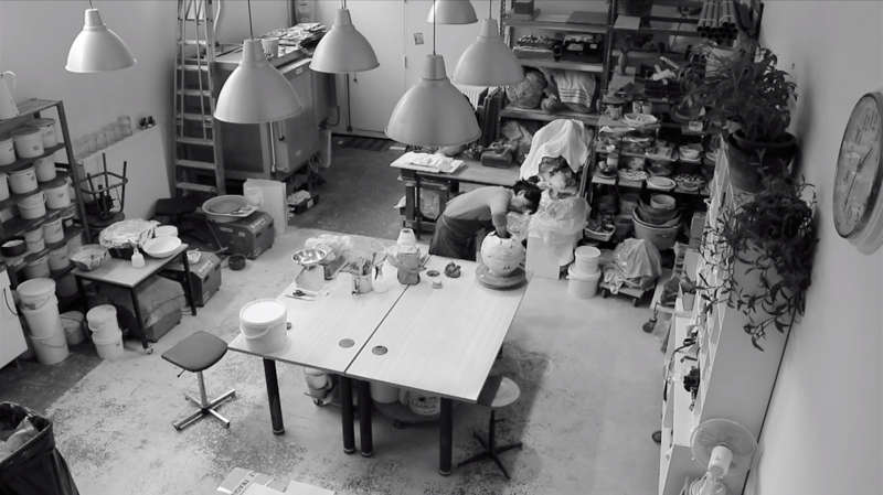 Filmer d’un point de vue élevé des artistes au travail, tel est le point de vue adopté par Stéphane Mortier dans son projet Quotidien d’atelier. Ce que l’on voit, d’un peu haut donc, ce sont donc des corps, des corps en action, des corps en train d’accomplir des gestes auxquels les artistes ne font pas attention puisqu’ils doivent les faire et qu’ils participent de leur travail.