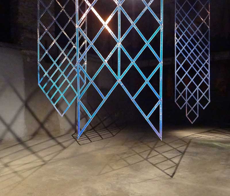 Il s’est pour cela approprié le cuir qu’il fait chatoyer dans des couleurs incernables et iridescentes en le découpant en bandes fines, segments qu’il fait s’entrecroiser comme un grillage qu’il installe entre ciel et terre, et dans l’autre partie de l’exposition, au sol. Le cuir holographique des étendards est une sorte de « vrai faux » matériau. Ce cuir synthétique vient prendre à son piège le souvenir lancinant de l’amour courtois, du tournoi et des lances qui se brisent, du combat à l’épée. Ici les étendards qui faseyent dans la lumière du soir projettent au-delà du vrai et du faux des ombres qui se conjuguent, dans une nouvelle réalité visuelle avec celle, transhistorique, de l’art.