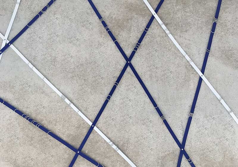Dans un second temps on trouve, au sol, deux rectangles de couleur bleu, blanc et gris de la taille d’une piste d’escrime, Scrima Ex Scrima. Floryan Varennes réinterprète les lignes et les trajectoires à partir du combat de référence qu’est l’escrime qui, pour lui, constitue la source de l’appareil formel et le principe d’engendrement des lignes qu’il déploie et qui, cette fois, se croisent au sol. Striant l’espace du tapis où se règlent les combats, les segments écartelés parlent la langue du duel. Le duel est la forme strictement codée d’une rencontre entre deux corps masqués, anonymes, lancés dans la bataille originelle, inoubliable parce qu’inscrite dans la mémoire de la chair qui veut la dépense, l’effort, le tremblement, la victoire ou la mort. Incidemment, l’air ambiant s’est empli d’une brume dans laquelle chacun se retrouve immergé. On se retrouve comme prisonnier dans la bataille d’une guerre passée, et l’on comprend que ce faux-semblant ne cesse de nous perdre.