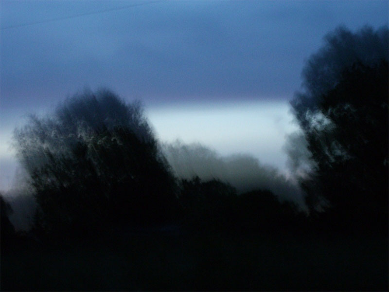 Comme le bruit d’une rumeur se répètent des sons scandés à la manière d’une comptine arrêtée dans son élan, la comptine entêtante renaissant d’un disque rayé sur la platine d’un phonographe quand derrière naît le mouvement du jour qui s’est levé et s’éclaircit encore... Comme des chats pleurent, grincent un peu ces sons de la rumeur parmi les brumes vagues qui se dissipent avec lenteur sous les arbres des haies où volettent des oiseaux vifs et pressés dans la pénombre de l’entrelacement des branches et des ramures de ronces. Et bleutées derrière flottant sur l’herbe verte des nappes de brouillard s’effilochent, se condensent, se rapprochent et s’étirent imperceptiblement quand jappe un chevreuil bruyamment provoquant l’envol d’un corbeau et de deux étourneaux dont chaque corps sous le ciel trace alors un point fuyant qui vient à passer dans les yeux, une tache sur le globe oculaire voguant, un petit signe de rien, léger et surnageant, à la surface en une danse qui s’éloigne, se retire, s’écoule, les oiseaux disparus, dans la largeur du ciel et l’infini des gris... Une voix crie « oui-ya » ce qui ne veut rien dire mais se trouve-oui, ensoleillée comme un acquiescement tandis que j’approche de la fenêtre et fouille une touffe d’herbes épaisses derrière laquelle des mouvements se découvrent, « des mouvements de quoi ? » C’est ce qui occupe alors le temps pendant que le silence autour, dans ce milieu, s’installe lentement, lentement..., lentement, mentalement coule comme le bâillement vient éclore dans le sans-bruit, comme un froissage éteint, inaudible et tendu, dans le profond du pelage de neige d’une sorte de chat dormant...