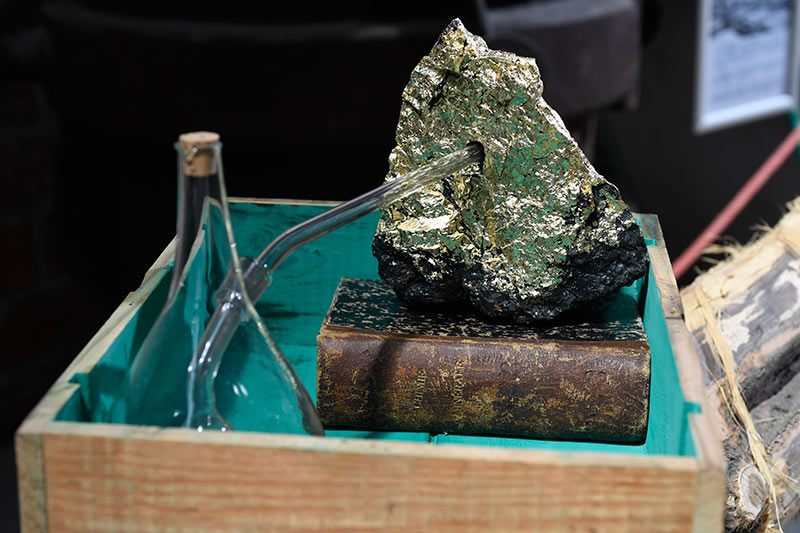 PP : À l’intérieur on va découvrir plusieurs œuvres dans un agencement hétéroclite, avec des pépites dorées, des évocations historiques de la mine avec des enregistrements, ainsi que des sculptures sur bois. Comment fonctionnent ces éléments entre eux et que disent ils ?