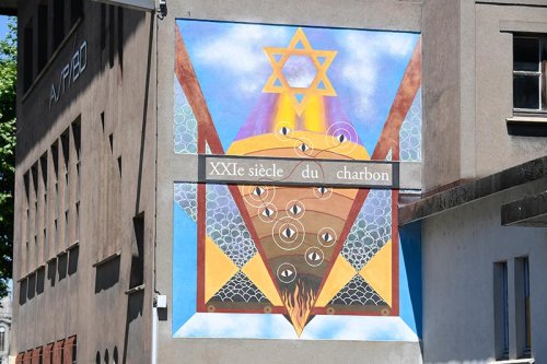 SL : A l’extérieur j’ai choisi de réaliser une fresque talismanique. Ce qui est différent de l’emblème. L’emblème étant la description d’une transformation, comme une "notice". Alors que le talisman est actif en permanence. Comme un outil qui s’affaire. Il a un double usage de soin et de protection. Certains peuvent aussi bloquer ou piéger le regardeur. Cela se noue sur le parcours du regard dans la construction de la trame. Ici, je leur ai attribué une valeur de soin avec une charge yang, une douceur guerrière et résiliente. Avec un côté actif et dynamique, le dessin suggère la remontée des âmes emprisonnées dans la terre jusqu’à une étoile qui est le sceau de Salomon. L’idée est d’activer cette remontée en une élévation rayonnante et vibrante. Sur le talisman, une phrase sera apposée : « XXIe siècle du charbon ». On peut comprendre cette maxime de 2 ou 3 manières différentes. Que le XXIe siècle sera un nouveau siècle du charbon, matière qui est toujours intéressante d’un point de vue énergétique. On peut y lire aussi que l’on n’est pas sorti du XXe siècle et d’un certain rapport au labeur, pour que l’on ne subisse plus l’expression "aller au charbon". Charbon pouvant être compris ici aux deux sens du terme, le minerai et le travail. L’enjeu pour moi c’est le travail en pleine conscience du charbon...Et il y a du boulot !