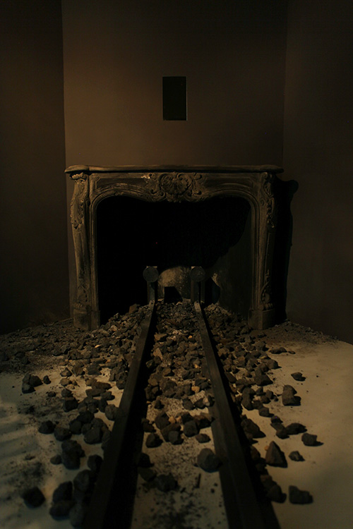 SL : Cette œuvre s’appelait Soli sol soli qui veut dire « au seul soleil de la terre ». Cela a été ma première installation en 2011, qui a été matricielle dans mon parcours. C’était une cheminée avec des rails venant buter contre une grande armoire murée. Une cheminée et une armoire comme deux seuils, magiques mais hors de portée, car l’entrée nous échappait, car elles étaient de part et d’autre obstruées.
