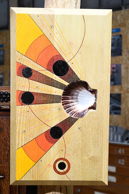 SL : A l’intérieur, il y aura quatre œuvres. Les premières comportent trois ilots totémiques que j’appelle Les corvivances. Le titre suggère ces corps qui ont survécu plus que vécu. On fait re-venir à nous la dimension charnelle et corporelle des objets et des vivants. C’est avant tout des œuvres énergétiques. Les corvivances sont composées de deux éléments principaux. Il y a les bas-reliefs empruntés à Joseph Herranz Ortega (le père de Michel Herranz, co-président de l’ASPIBD). Ils sont mis en regard avec des bas-reliefs que j’ai créé et que je considère comme des booster énergétiques. Ils sont en bois d’acacia (très puissant d’un point de vue énergétique et symbolique) avec des coquilles St Jacques et des disques de charbon incrustés. Dessus, sont dessinés les rayonnements de la coquille qui se dirigent vers les disques de charbon et les bas-reliefs de Joseph pour les soigner. Et le soin se diffuse même au delà, car le rayonnement poursuit sa course. Le second élément est la diffusion sonore de deux témoignages, celui d’un ancien ouvrier de fond et ingénieur de la mine, l’autre étant celui de Michel qui est porte d’avantage sur des questions de vécu et de famille avec son père Joseph.