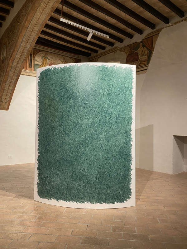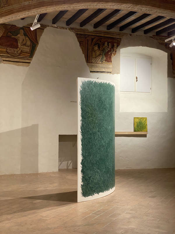Le tele, in assenza di telai convenzionali, occupano lo spazio, portando con sé un innato movimento e, proprio come i processi mentali, divengono mutevoli a seconda delle condizioni ambientali ; strutture, dunque, che lasciano l’opera libera nel contesto in cui è posta.