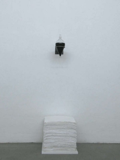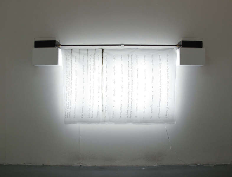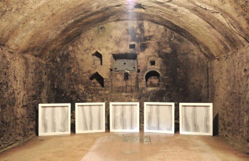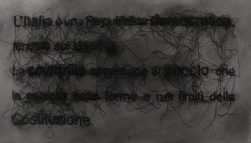 Through a silent and meditative inquiry, she lets us perceive those hidden places that are imbued with humanity and spirituality, often too ambiguous and disturbed by the many visual intrusions. By way of complex mechanics, her installations produce sensitive alchemies. The artist exposes the meaninglessness of the world – in the grip of the bulimic overwhelming of images emptied of the emptying ability and invites the spectator to a structural reset and encouraged him to rediscover the charm of the look and the invisible magic of the images ; the irreflection in which man and world bend. In her investigation around the social dimension as the centre of the ethical principles sustaining an individual’s commitment, the artist offers an unique crossroad of theoretical perspectives : her installation Italia 100% is inspired by the inconsistent practice of the Italian Constitution ; with Linea di Orizzonte, she homages the Declaration of Human Rights ; the work Senza Titolo is a reflection on the Four Days of Naples and its partisans and in the installation Irrigazioni e Mappe she offers a real experience. Francesca Capasso creates structures, vibrant matter in evolution, capable of bringing into life that subtle memory - deep and historical - which becomes motion in action and a sign that, thanks to water, ink, light, pigments and clay, will resist current events. Her work is the combination of different chemical and ritual processes echoing ancient crafts (embroidery ; dying of fabrics in boiling water, salt and pigments ; hand-cut cloth and the dry-off technique that reminds of old times workman distilling flowers essences or land irrigation). Each piece originates from unconscious gestures that cleverly bring to life a message.