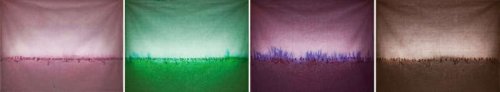 Thus, Sensitive alchemies, in which the artwork unveils itself and charms the spectator into being part of this mutation and revelation. In Linea di Orizzonte, a set of flags embroidered with the Human Rights articles, or in the installation Italia 100%, the verb/sign is snagged, purposely appearing illegible at first glance, but, thanks to the revealing power of light beaming on the hand-dyed fabrics (each colour is the mix of every country flag colours), the words appear conveying the esthetical nature of her inquiring work.