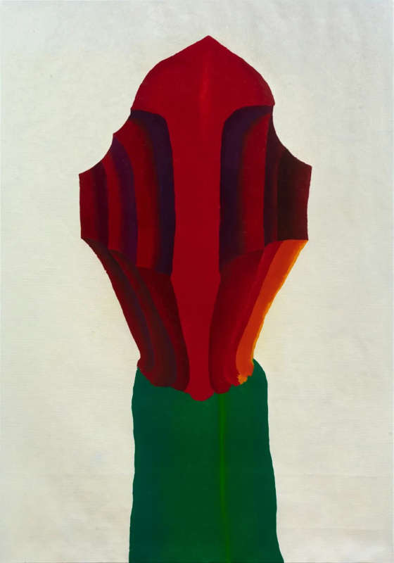 Les tableaux nommés « Prototype d’émotion » présentent d’énormes figures, des arbres-monde aux franches couleurs, qui se détachent du fond. L’espace de chaque tableau s’affirme par la présence colorée et matériologique d’une peinture épaisse. Les formes axées et faussement symétriques s’organisent selon une composition verticale. De légers modelés, presque sans ombres portées, déréalisent les figures. Elles semblent posées sur un sol qui vient couper la partie inférieure du fond. D’autres fois, elles flottent dans l’espace ou bien repose sur le bord du tableau. La ligne de partage entre terrestre et céleste, instable d’un tableau à l’autre, nous invite à ajuster notre verticalité en présence de chacune des œuvres. Le lieu du tableau n’est pas celui d’une représentation mais bien le lieu d’une expérience sensible qui mobilise tous les sens. En reprenant la belle formule du livre de Paul Claudel sur la peinture hollandaise L’œil écoute [2], François Jullien nous rappelle que la pensée chinoise nous apprend à écouter, ni avec l’oreille, ni avec l’esprit mais avec le souffle énergie. [3]