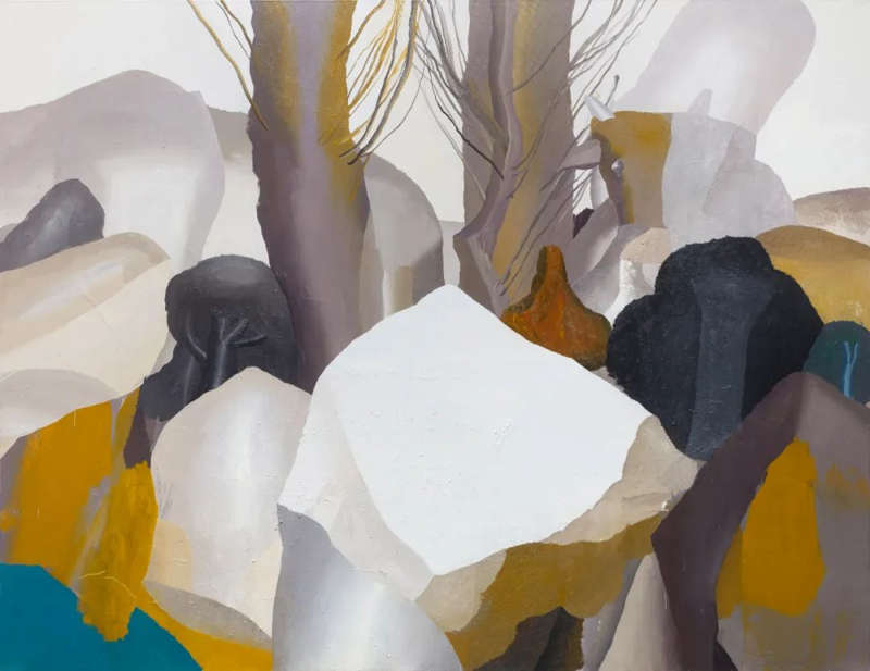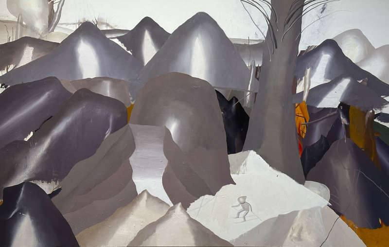 Peut-être fallait-il en passer par la chaosmose ? C’est ainsi que nous pourrions approcher les grands tableaux : Alchimie - Vous êtes la montagne - Si la nature détenait l’émotion. Une ligne horizontale sépare le terrestre d’une surface laiteuse en guise de ciel. Des paysages en camaïeu d’ocre et de gris composés d’un amas bourgeonnant de minéral et de végétal. Les gros troncs dont on ne voit que la partie inférieure s’échappent du tableau et évoquent un hors champ. On passe du très près, au très loin, à l’intérieur même du tableau, lorsque l’œil circule d’une forme à l’autre dans une représentation hors mesure. Le spectateur est invité à décentrer son regard, à se détacher de la visée. Arbre, montagne ou rocher se rapprochent ou s’éloignent sans aucun ordre d’étagement perspectif. Un minuscule skieur sans visage atteste de l’immensité du morceau.