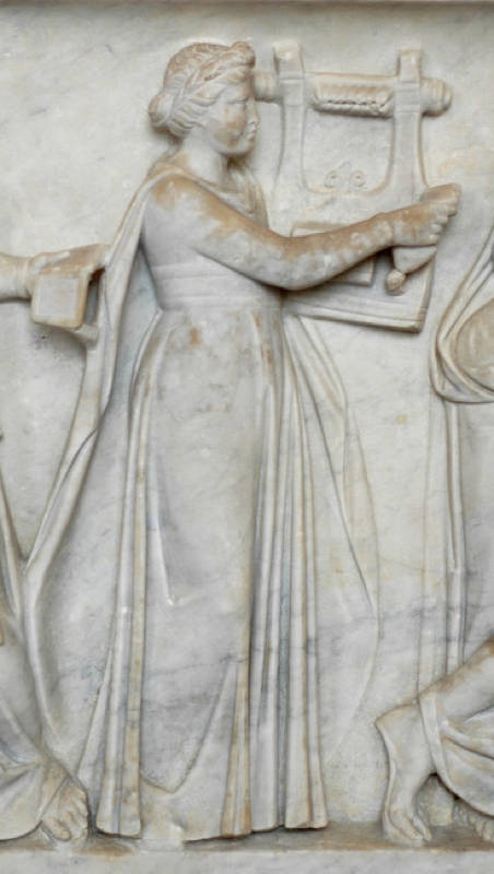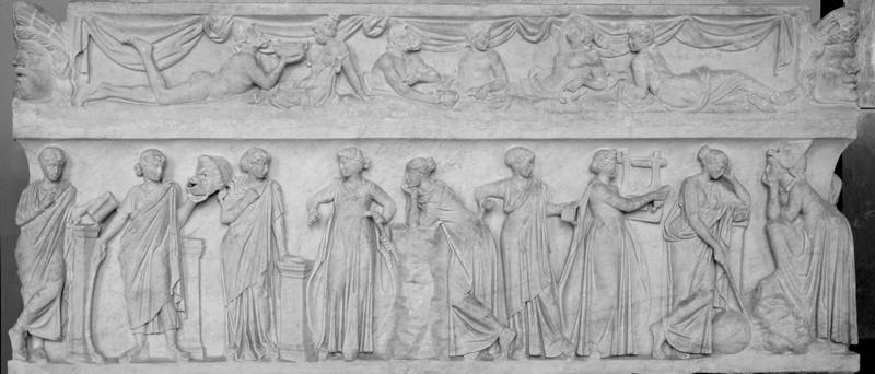 Image d’ouverture : « Sarcophage des Muses », représentant les neuf Muses et leurs attributs. Marbre, première moitié du IIe siècle ap. J.-C., découvert sur la Via Ostiense. Collections du Musée du Louvre. ©Wikimedia, photo Jastrow, 2006.