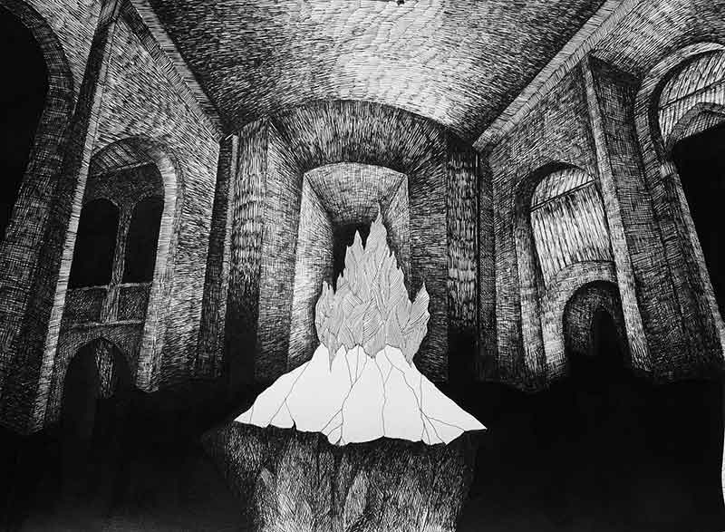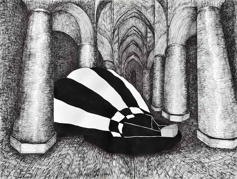 Christian symbolism and the church architecture emerge in Mária’s œuvre regularly, last time in the series Stations of Crisis. In the newer Brave World the artist directs our gaze into the interior of sacral architecture : to the naves, transepts and chapels of the cloisters and cathedrals from Middle Ages. These are without doubt the most monumental material and artistic manifestations of the Christian tradition in Europe. She brings various strange objects and phenomena to these spaces and therefore disturbs the genre impression of the drawings. Indeed, these depictions of church interiors denote more metaphysical than physical space, but deprived of its divine aura represented by the light coming through the colourful glass windows. In these mute skeletons are the fragments of the secular world trapped in the iconic black matter/fluid. The artist shifts the discussion to the framework of thinking about systems (religious, social, cultural), about their borders, confrontations and overlaps. According to legends, at the beginning of the world there was light. And at the beginning of the art/painting there was a line drawn alongside the shadow.