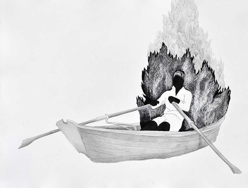 Days of Anger, referring with its title to the classic of Slovak literature, consist of representations of both everyday objects and universal symbols of our cultural circle, for example bread or boat. Things which are burnt, burning, flowing, or are drowning in themselves, produce the instant feeling of worry about the change of their state and/or state of matter. Mária adapts her technique – this time very soft pencil drawing and scratched black wax – so that she reaches more dramatic contrast, feeling of loss of security after being hit by imaginary lightning of anger.