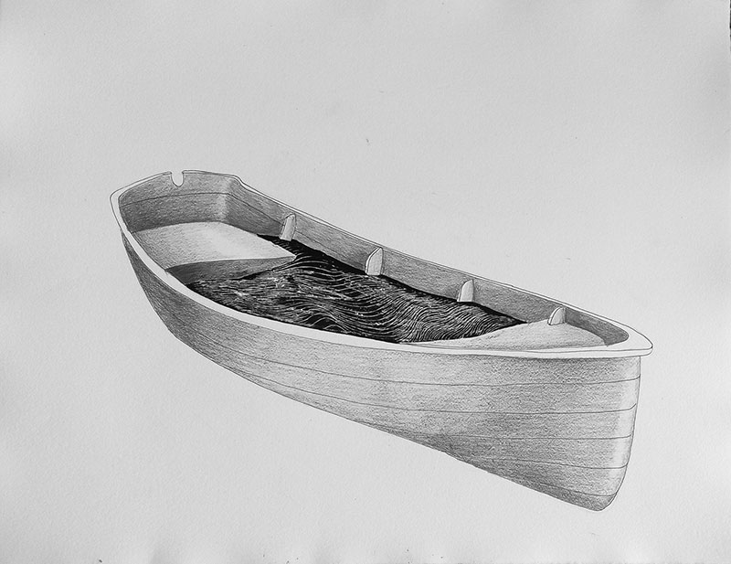 In the texts on the author’s artwork one can often read about scenic or latent potential for stories in her drawings. Anticipated storyline is based on images of stopped/hinted/expected movement (often of flight, heave or fall) of figures, things or disintegration of objects, architecture or fluid flow of a substance. Felt and implicit flow of visually frozen time is based on possible, anticipated or presumed situations which potentially precede or happen after the current static image. Expected action is usually minimal and artistically it is built very modestly but precisely. To use the terms based on literature – I would compare the drawings of Mária Čorejová rather to the reading of lyrical snapshots than to stories as they are not based on linear development of the storyline, but on a very modest and connotative symbolic, metaphorical or metonymic image which is present only in this moment (eo instanto). However, this moment is endless as it can be seen in three videos of Matěj Smetana (Cvičení podle Marie/Exercise According Maria, 2012 – presented at the exhibition Rozhovory, ktoré vedú inam / Conversations leading elsewhere, Kunsthalle, Bratislava, Slovakia, curators : 13 kubikov, 2013 – 2014 ) which were based on author’s drawings. In one of these Smetana’s animations, there is a boat half-full of black fluid rocking on the water while we are not sure whether it is moving somewhere or it is anchored to one point. It won’t sink ; the fluid won’t either absorb it or disappear. The image is happening, it takes place in time and at the same time it is trapped in no time without any beginning or end – it is trapped in a neverending moment.
