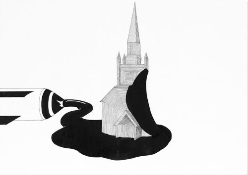 The author is constantly returning to certain topics. She is working with Christian symbolism in the form of sacral architecture, spaces, objects, and their variations. Altars split by a perfect cut or aisles in temples overgrown by flying balloons (e.g. in The Moment of Truth) do not necessarily cause the feeling of heresy – in Maria’s tidy way of presentation, they are rather visualized images, opinions, and frustrations of a “naïve” humanist of today. She expresses her point of view on religious dogmas, limiting rules of a society or church idols (e.g. in Your Truths Are Like My Moods, etc.). She presents similar attitude also to other topics of Western civilization and its historical relicts in society, aesthetic of weapons and war (Beauty) but also for example to sport or hunting and their impact on society (for example in Little Pleasures of the Previous Days, Better Place for Life). She constantly returns to an ancient conflict of what freedom means for a man (desire to fly, to move freely, or to think) with where the limits of a man are – limits meaning also a person´s own intimate space, internal mental space or home (The Place of Ghosts). She reaches the most lyrical form in her graphical cycles focused on the motif of a boat which is sinking – or on the other hand – emerging from water. She varies this motif in many – but very similar – ways (cycles Ark and The Only Possible Solution). Often she (not only in case of these works) chooses the installation which is emphasizing the repetitiveness of these motifs. In such a case the whole unit of her pictures creates some kind of a narrative network in which the level to which is an object flooded by a black mass (water) holds the meaning of a micro-story.For the author, the presence of a dominant black space is not only an impressive artistic element which is bringing her drawing closer to a painting ; often it is the main holder of the core idea of the artwork. “Black mass” is dynamically growing through the picture, it is flooding the spaces of architectural buildings, it fills an empty space, it interrupts the integrity of objects, and through its secret darkness it communicates with the action of a present figure. In such a way it creates one of the most interesting moments of the author’s artwork. It is so because this black mass is not only a holder of a negative charge of the scene in the drawing but on the contrary, it asks us to what extent is our perception influenced by prejudices and dual division of the world to “up and down”, “black and white”, “good and bad”. It looks like she is testing where we would end if we change them, if we turn them over, or if we deny their existence.