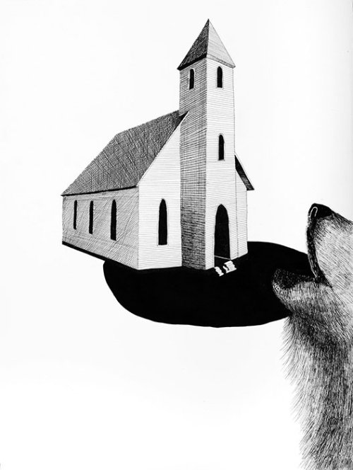 Further, in the latest series Oh Your God appear various motifs from the older series on one sheet of paper - such as stuffed animal trophy, medieval church or ancient temple. They are carefully arranged in an unreal setting, though quoting well-known spaces. They create a labyrinth of references pointing back to the roots of our culture. These places and objects are seemingly struck and overgrown by expanding trees, when so-called nature confronts so-called culture. Their physical and thematic overlappings vary from the bloody deer decoration on the walls of Bratislava’s castle through the associations such as that of the mythical wooden origin of the first architecture to the thematization of the unscrupulous wood harvesting fueled by greed in today’s Slovakia.