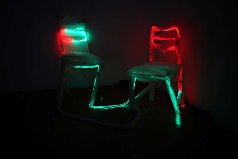 Eunok Hwang placed two damaged and fragile chairs side by side. Hwang connected the two chairs with a string of moving LED lights. Her installation directly designates the current situation between North Korea and South Korea, as the two countries have been ripped apart and wounded while yearning for healing and a peaceful reunification. According to Hwang, she tries to create the disconcerting feeling of two bodies whose blood circulation slows down, pauses, and then crashes.