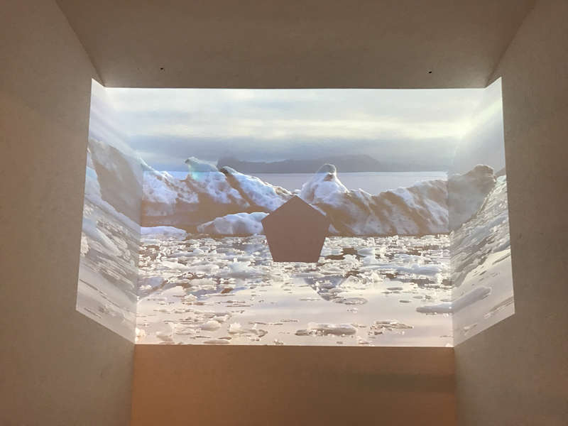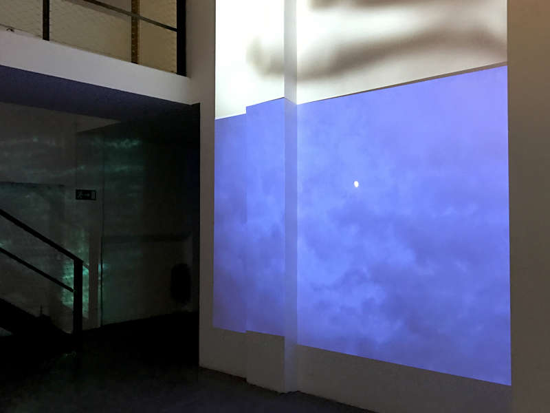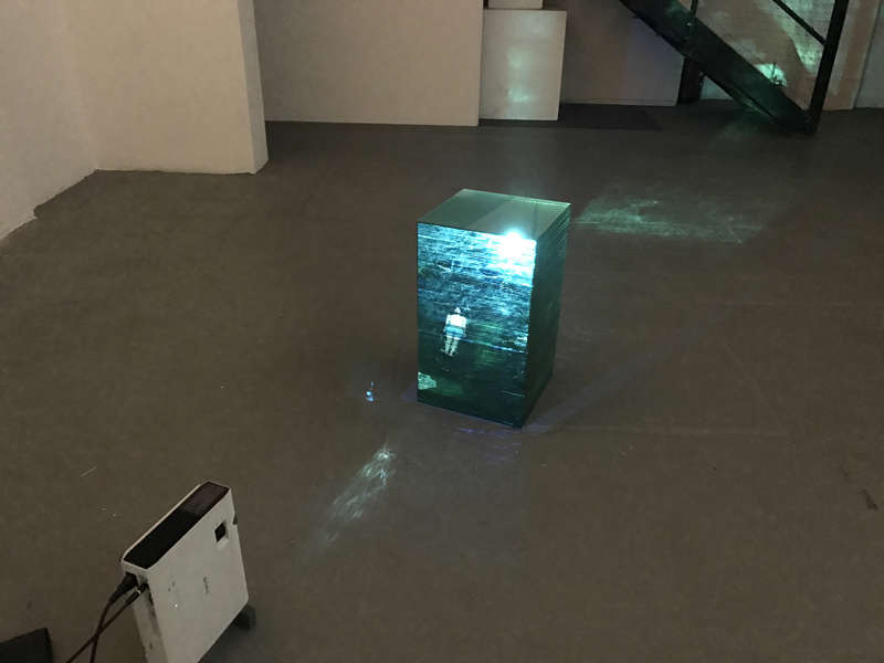 Nature as a state of flux also gives inspiration to the artists in this show. Nature itself is a station on the move. Konrad Mühe placed a stack of glass plates on which a projector projects a moving image of himself drifting in the ocean in a constant state of flux. The cube of stacked glass sheets captivates the artist’s body inside the cube while it disperses the rest of light into the gallery space. The artist’s body keeps his arms and legs stiffly straight while the artist let himself flow along the water. The artist resists and submits his body to nature both at the same time. Like a series of physical tests, the viewer observes a body under the influence of exterior conditions.