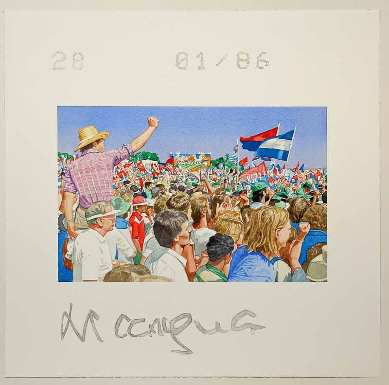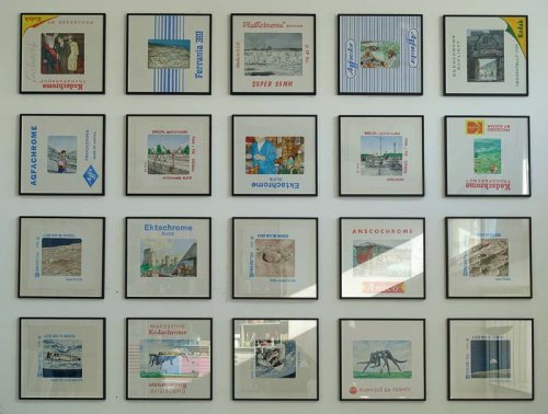 Paul Simon topped the charts in 1973 with Kodachrome, his hit single celebrating the “nice bright colors” of Kodak’s popular film for slides. Those vivid “greens of summers” may well have given us the illusion, if only for a moment, that “all the world’s a sunny day.” When contemplating Stéphane Belzère’s Diaquarelles, which entirely cover a large wall of his Parisian studio, we can feel that same intense luminosity. The title of the series is a combination of “diapositive” (slide) with “aquarelle” (watercolor). These modestly scaled works convey a sense of warmth and familiarity, no matter what the images represent. Whether we’re looking at a smiling family portrait taken at the beach under a cloudless sky, or a scene from the Sandinista Revolution in Nicaragua, our gaze is first and foremost captivated by the sparkling, saturated color.
