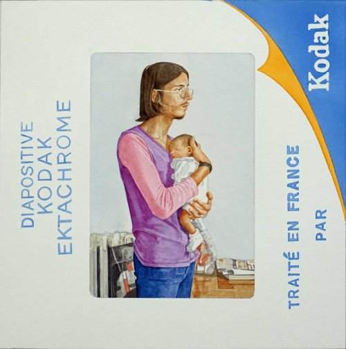 Stéphane Belzère has been working almost exclusively on his Diaquarelles since 2019. In these watercolor paintings done from slides, which have been scanned and then enlarged on a light table, he paints not only the photographic image but also the slide frames with their brand names and personal inscriptions. The square format of the paintings, which are ten times the size of the original slides, recalls the format of the slides themselves, reminding us of their history and their widespread use not that long ago. Positive images (as opposed to negatives) were already being developed on glass plates and projected using a magic lantern in the 1800’s. With the commercialization of slide film such as Kodachrome in the mid 20th century, their popularity peaked in the 1960’s and 1970’s before declining in the early 2000’s with the introduction of digital technologies. Those of us who grew up in the 1970’s may still have memories of family slide shows for viewing pictures taken over summer vacation, or of slide-lectures in school with the steady hum of the projector in the background.