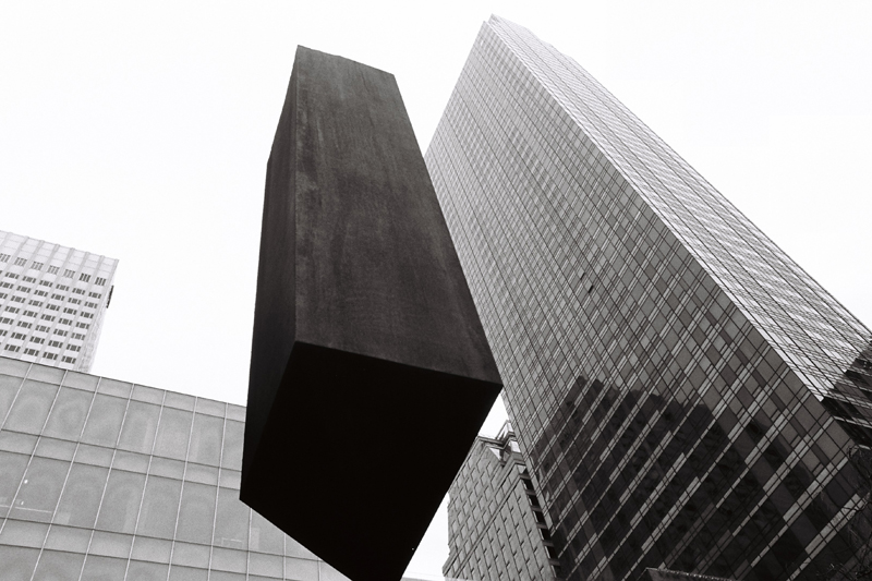 Dans une belle série en noir et blanc où l’on retrouve des bâtiments connus, ce qui apparaît, c’est bien que le regard est en quelque sorte happé par le visible et dans le même temps se révèle à lui-même comme formé par ces croisements de lignes que seule la prise de vue permet de matérialiser. Ainsi l’immensité de l’arête d’un gratte-ciel se trouve-t-elle confrontée aux croisillons minuscules d’un vitrage ou l’immensité pourtant quasi incommensurable d’une rambarde minuscule.