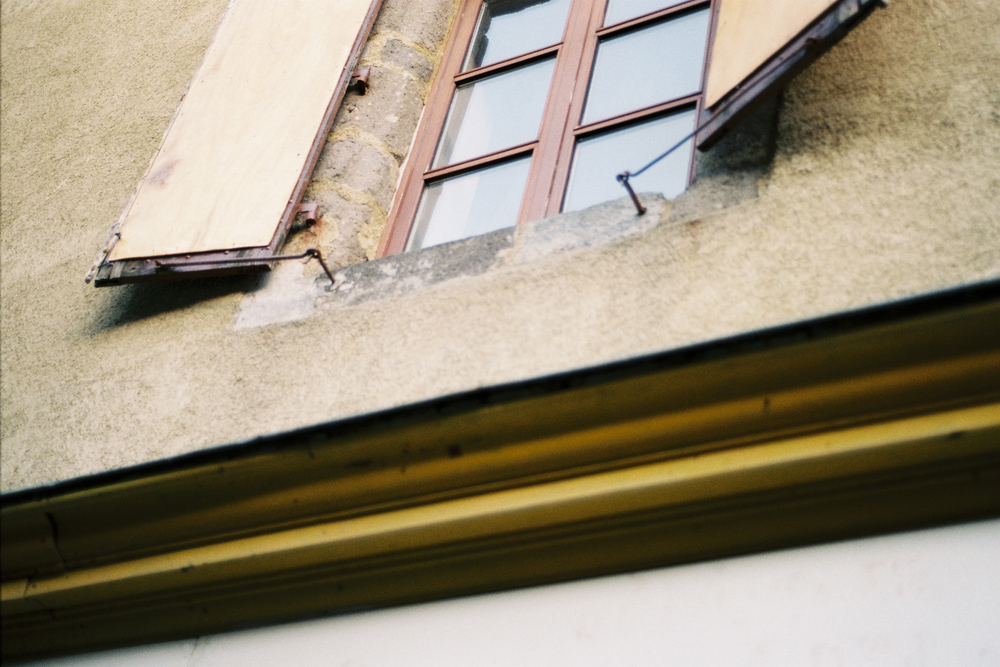Il en va en partie de même dans une autre série où des toits banals de tuiles et des murs d’immeubles tout aussi banals se mettent à parler la langue de l’incision et de la découpe. Dans ces images cependant, Antoine Tricot éprouve le besoin de s’appuyer pour les montrer sur un pan de ciel bleu ou de feuilles vertes, révélant ainsi que tout bâtiment, toute œuvre humaine posée dans le paysage, découpe autant le ciel qu’il s’inscrit en porte-à-faux vis-à-vis de la nature, comme l’évoquent les autres images de cette série.