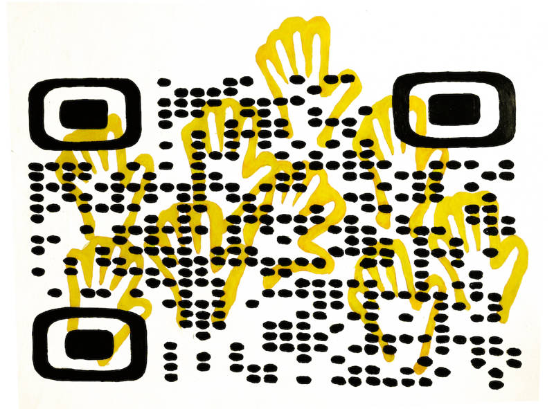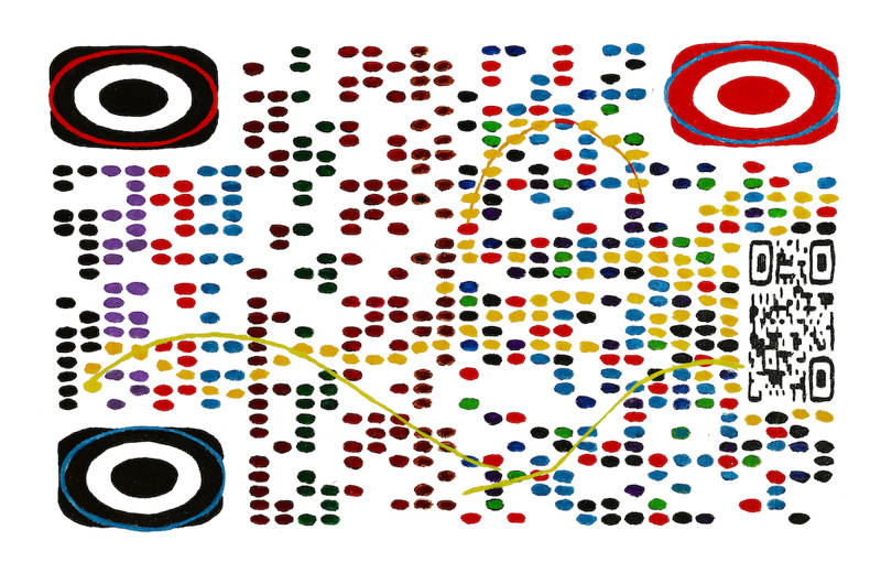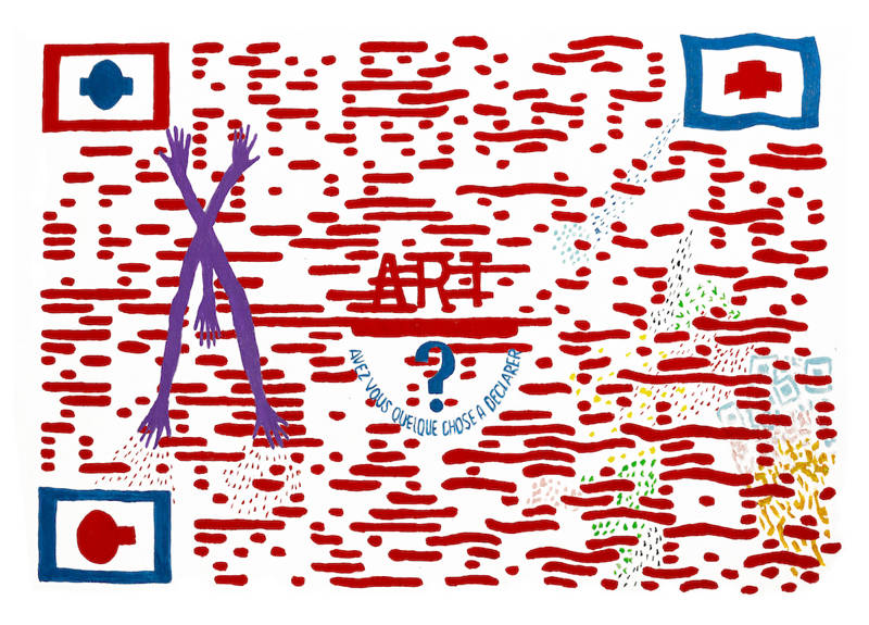 Ce panneau de « douane culturelle » est positionné à l’entrée de chacune des expositions d’Hervé Fischer. Cette question sociologique a été fondamentale dans tout le travail de l’artiste-philosophe et elle est devenue mythanalytique. Depuis plus de cinquante ans, Fischer n’a eu de cesse de questionner l’art et son milieu en en dénonçant une approche trop élitiste et conventionnelle et d’interroger le mythe de l’art. Pour lui, l’art est une question sans cesse posée, une réflexion en permanence renouvelée, une expérience à vivre au jour le jour pour mieux interroger les imaginaires sociaux actuels. Théoricien de l’art sociologique, Hervé Fischer a déployé à travers l’Europe et l’Amérique de très nombreux dispositifs participatifs, sans pour autant abandonner ses préoccupations plastiques. Revenant à la peinture en 1999, il questionne les icones du numérique comme celles des peintures pariétales préhistoriques et des sociétés premières. La sociologie de l’art impose une lucidité, mais le mythe de l’art, qui évolue aussi dans la diversité des sociétés et des époques, demeure notre interface première, à la li-mythe de notre rapport au monde.
