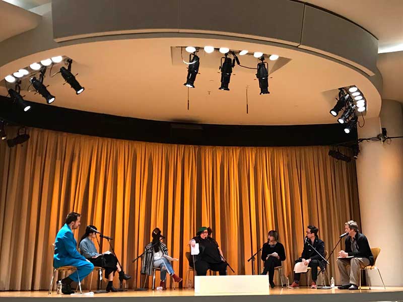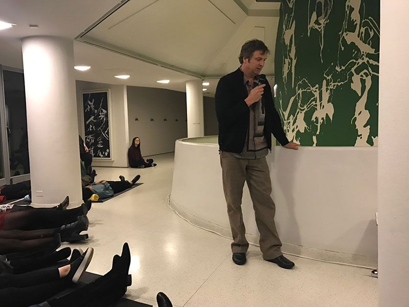 The museum also presents The Hypnotic Show, a project by Marcos Lutyens and Raimundas Malašauskas as one of the public programs related to the exhibition. The Hypnotic Show at first invites people to sit in an auditorium listening to a casual conversation. Then the participants are guided down the Guggenheim’s rotunda and finally lie down on a floor. Lutyens starts to lead them into a trance-like state. With eyes closed, the commissioned texts by seven fiction writers are delivered to listening ears. Lutyens’ soft voice escorts the audiences into sensual realms of fantasy. While there are no external stimuli except the hypnotic voice reading the texts, each person in the audience vividly experiences sense perceptions like colors, textures, smells, and shapes inside the mind. The audience experiences The Hypnotic Show, as with the other artworks in Tales of Our Time, through feelings so orchestrated as to induce an awareness of their very qualities in the actual moment.