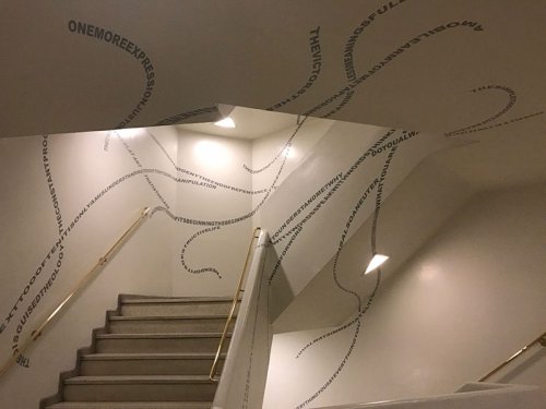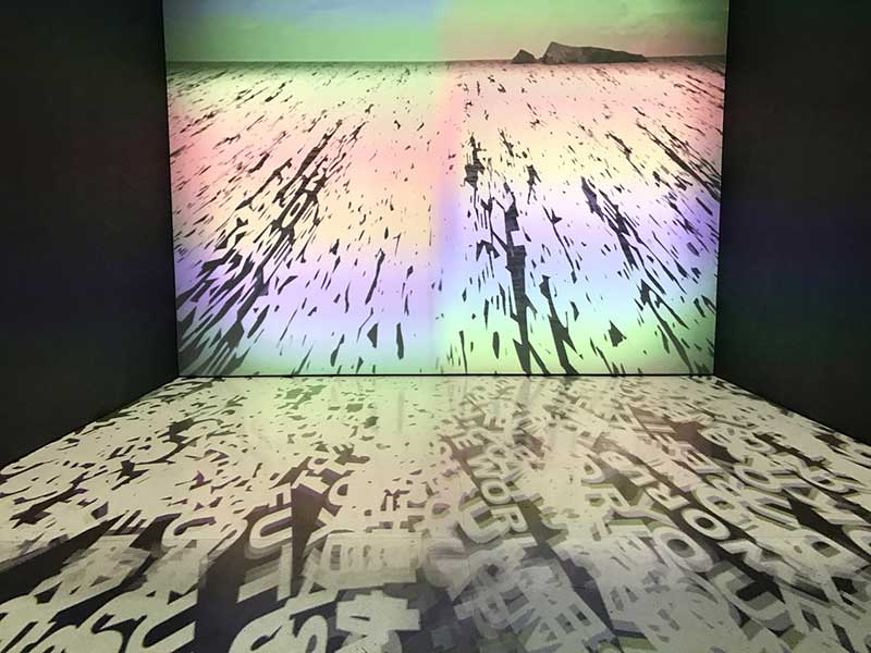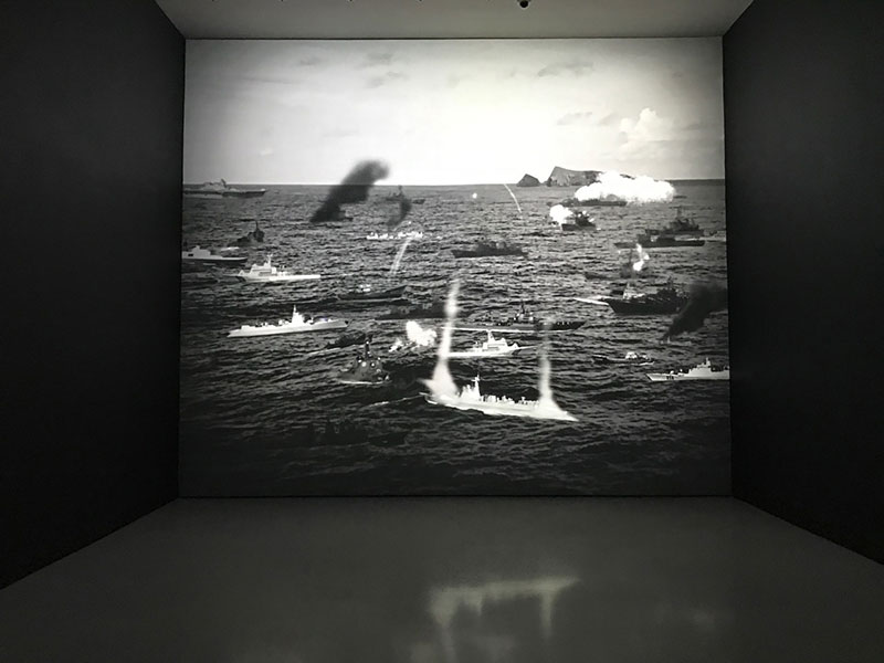 In In The End Is The Word (2016), Tsang Kin-Wah deals with the territorial dispute between China and Japan over the Diaoyu Islands (or Senkaku Islands). These are located to the east of Mainland China, northeast of Taiwan, west of Okinawa Island and north of the Ryukyu Islands. Each country asserts ownership of the islands from a different historical justification. China lays claims to the islands from events in the 14th century, while Japan insists it controlled the islands from the first Sino-Japanese War in 1895. The artist made a multi-channel video animation that features a fictional situation in which various military ships seem to fight against each other, claiming for the borders that define the islands. In the end of the video, a large number of texts come out of the scene to the walls and floor, creating an abstract world of words. They are unreadable because the sentences pass by so feverishly, suggesting the heated on-going political dispute. Tsang also creates text-based installations on the walls inside the Guggenheim Museum. The texts seem to flow around the space without borders because they are installed in multi-directional ways without a beginning or an ending.