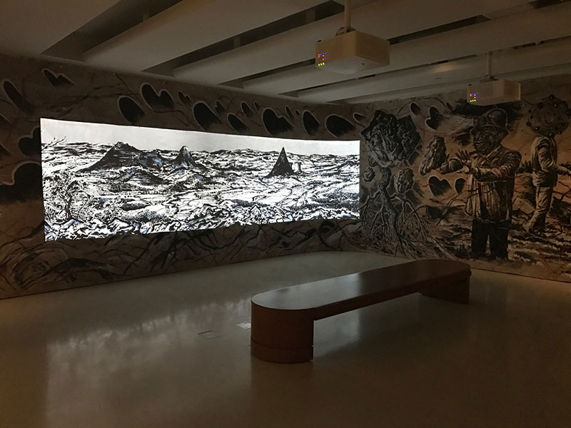 A landscape consists of the visual features of a natural and/or man-made land. In the era of the Anthropocene, most lands in the world contain the various ancient and modern civilizations. The lands on earth are no longer able to separate the natural and the cultural. In Land of the Throat (2016), Zhou Tao presents a two-channel video exploring a landscape that appears to be a natural hill at first. However, it is an artificial accumulation of waste and soil from so-called “foundational constructions.” For Kū Lüè Er (2016), Kan Xuan traveled across China for five months, taking pictures of the remains of 110 ancient cities with her I-phone. The artist displays the thousands of images she shot during her journey compiled as a series of videos on eleven monitors. The artist searches for Chinese historical dynasties and changing territories that are hidden under the soil of the landscapes. Sun Xun’s Mythological Time (2016), an animated video with sound, and a large ink, graphite and acrylic wall painting, creates a dream-like scene, combining moving images of mythical creatures, flies, tanks, coal miners, and mountains. The video connects the China’s traditional myths in nature with the modern history of coal-mining.