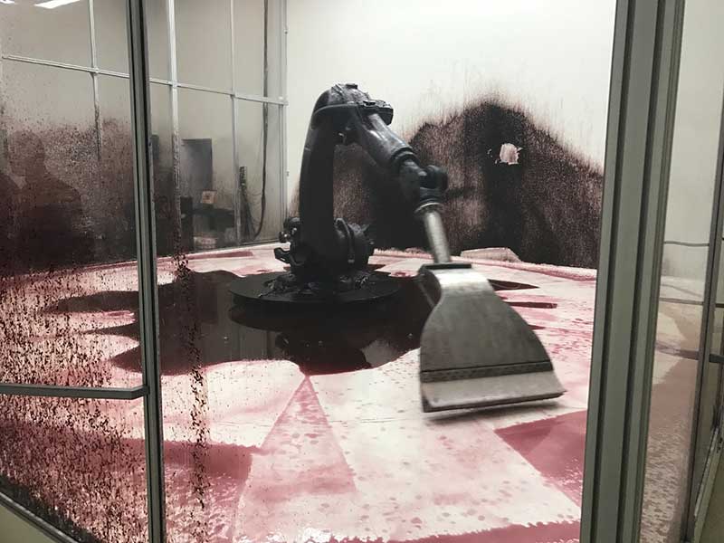 Some of the artists here offer sensual and dreamy experiences rather than words. In these works the audience senses and feels, rather than reads, stories through bodily experiences. Sun Yuan & Peng Yu presents Can’t Help Myself (2016), a gigantic robot that mops up blood-like liquid based on a set of rules : i.e., a sensor detects the moment when the red liquid flow passes a certain boundary, and the robot then moves its shovel-like arm to clean it up and splash it off to the glass walls. It is a purely visceral experience, but a strong metaphor for what contemporary society is going through. The Yangjiang Group gives a station for people to drink a cup of tea, with a blood pressure station for visitors to measure the calming effect–blood and skin tell the unwritten tales of the audience’s relationship with this historically fraught drink.