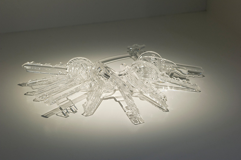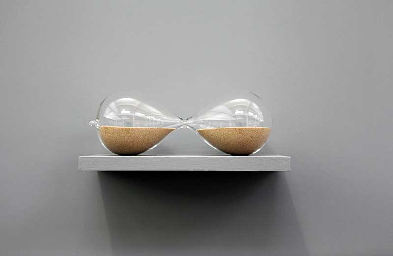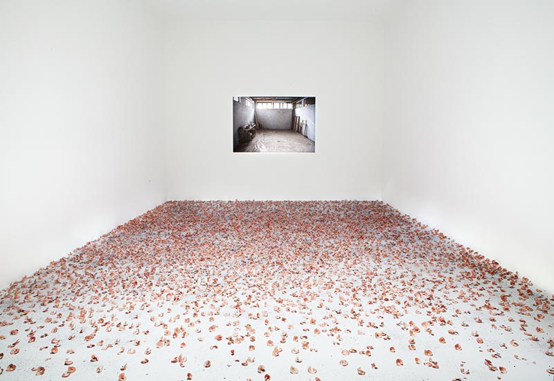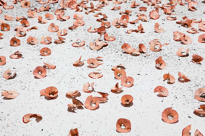 Puis, à mesure que j’en prenais conscience (tout retour ou voyage à Gaza devenant de plus en plus compliqué), j’ai commencé à matérialiser ma propre situation d’exil à travers une série d’œuvres : Sans titre (2007-2014), réplique de mon trousseau de clefs palestinien en résine puis en verre ; Suspended Time (2006), sablier rempli de sable présenté à l’horizontale ; la performance Impossible Journey (2002-2009), dans laquelle je déplace avec une pelle, jusqu’à épuisement, un tas de sable d’un mètre cube environ de part et d’autre d’une ligne virtuelle, un déplacement inutile signalant en creux une mémoire enrayée et un corps mis à l’épreuve de la répétition et du non-sens ; la performance installation Hannoun (1972-2019), « coquelicot » en arabe, que j’ai réalisée pour la première fois à Venise en 2009 et pour laquelle je recouvre le sol d’une salle de copeaux de crayons à papier rouge que je passe plusieurs journées à tailler manuellement en forme de corolles. Ce champ suggéré de coquelicots fait écho à son symbole dans la culture palestinienne, comme française : la mémoire des corps sacrifiés au combat. Le sol recouvert de « fleurs » fait écho, au mur, à la photo de l’atelier que j’ai dû abandonner à Gaza. Deux espaces-temps impossibles : l’un éphémère (l’œuvre elle-même), l’autre inaccessible (mon atelier à Gaza). J’ai tenu à dater cette œuvre en 1972, en souvenir de ma première année d’école. Pour échapper aux devoirs qui consistaient à recopier nos manuels scolaires et apprendre nos leçons par cœur, je passais mon temps à tailler mon crayon, sous prétexte qu’il devait être très aiguisé…
