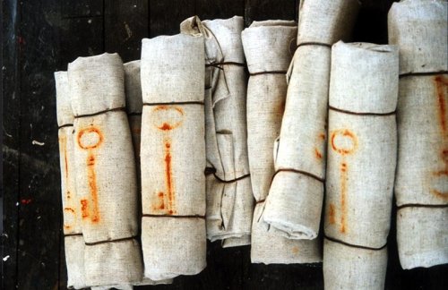 À la fin des années 1990, étudiant à l’École des Beaux Arts de Bourges, j’ai commencé à donner forme (plastiquement) à mon expérience de l’enfermement. En 1997, symbolisant la mémoire et le temps, la dépossession des terres, l’exode palestinien de 1948 et le droit au retour, l’espoir, j’ai transposé les empreintes de clefs de maison rouillées, par oxydation, sur des toiles de peintres roulées : Sans titre. Cette œuvre marque ma rupture avec la pratique picturale académique et mon désir de m’inscrire dans une démarche plus conceptuelle.
