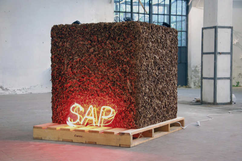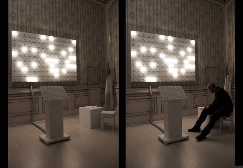 There’s not a story, not a narration : only fragments, intense fragments of noises and words carving the darkness, the same darkness in which the artist wrote a luminous text on the wall of the gate (an urban act, like Pompeii graffiti or New York tags), an unquestionable thought of Rousseau : “The inequality, almost non-existent in the state of nature, draws its strength and its increase by the development of our faculties and the progress of the human spirit and eventually it becomes stable and legitimate by the establishment of property and laws”. A firm, irrevocable and demanding declaration.