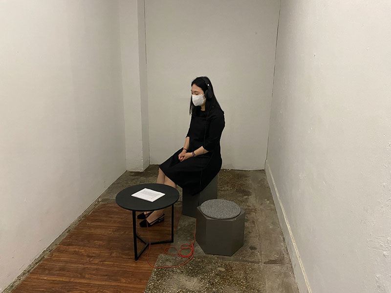 First, YoungEun Kim presents a sound that re-creates her previous work, Room 204 (2011). The work was originally created in the artist hostel Room 402 of Mullae Art Space in Mullae-dong, Seoul, where the artist stayed for three months. During her stay, the artist recorded the various noises heard across the wall and from around the building. The audience can listen to footsteps, faint voices of people, machine sounds, and other noises collected from the area. It is interesting to hear the sound Kim recorded ten years later in the same neighborhood. The sound initially recorded in 2011 is valid today as we can still hear similar noises in the district.