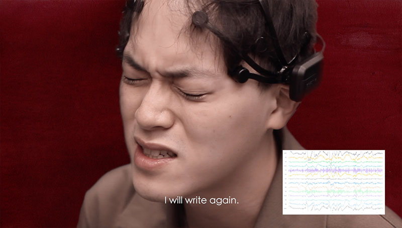 I also presented another video work called Empathic Audition (2017). The video revisits the historical letter written by Lee Woo Geun, a South Korean student soldier during the Korean War. The letter was written a day before he was killed by the North Korean troops. The letter, which was meant to be sent to his mother, was discovered on his corpse. In the video, two actors read the letter as if they were the student soldier during the war. While the actors imagine the situation of the war, an EEG (Electroencephalography) machine, a device that tracks the fluctuations in electrical processes of the brain, scans their brainwaves. When the actors feel strong empathy, their brainwaves are highly activated. Each sentence is followed by a short sequence of pictures of the Korean War being projected on smoke. The ephemeral nature of smoke evokes the concept of memory. Memory is an event of the past, but the memory stays around one’s mind even though it is not out there anymore. Sometimes big social memories like wars stay in people’s minds from generation to generation, and they affect human behaviors. Since the two Koreas are still divided, the trauma of the war still exists. The video allows the viewer to see how the actors feel the pain of the soldier. And the viewer is also able to feel the pain through the actors’ faces and voices. The feeling of the soldier in the past is transferred to the viewers in the present through the actors.