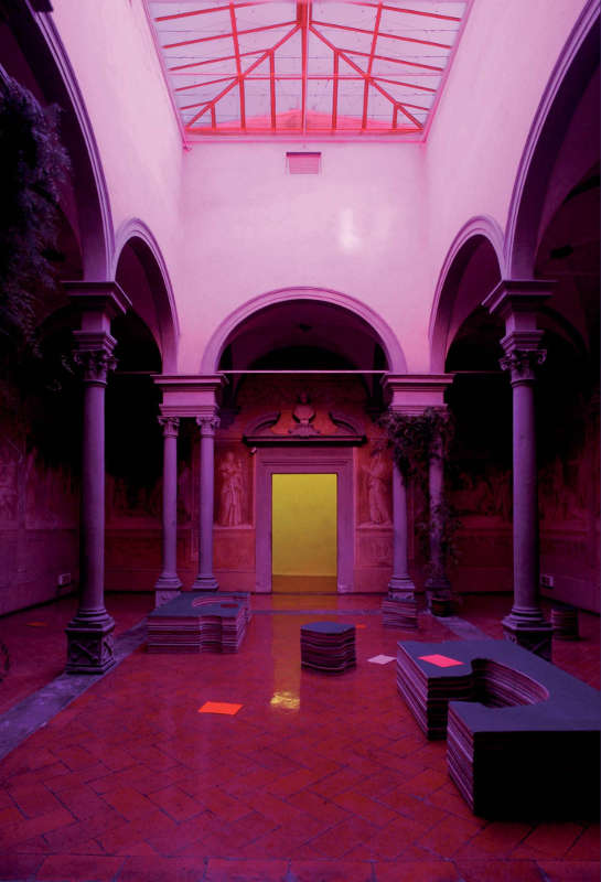 L’elemento cromatico in questo caso è costruito dalla luce, che entra nel chiostro filtrata da pannelli di plexiglass colorati, i quali modificano l’atmosfera dello spazio e la percezione degli affreschi monocromi realizzati nel Cinquecento da Andrea Del Sarto.