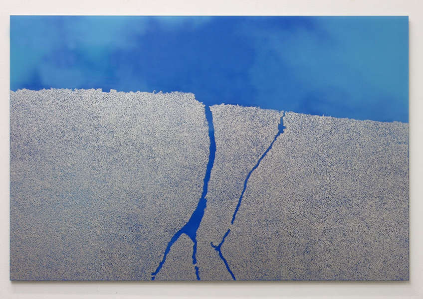 I lavori rappresentano le vedute aeree di foci di fiumi tracciate con un pennarello argento su fotografie del cielo.
