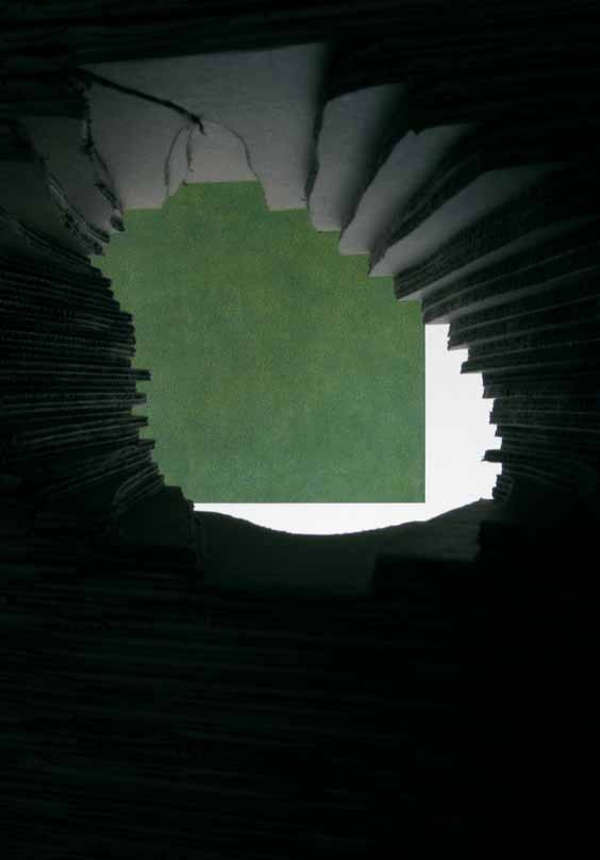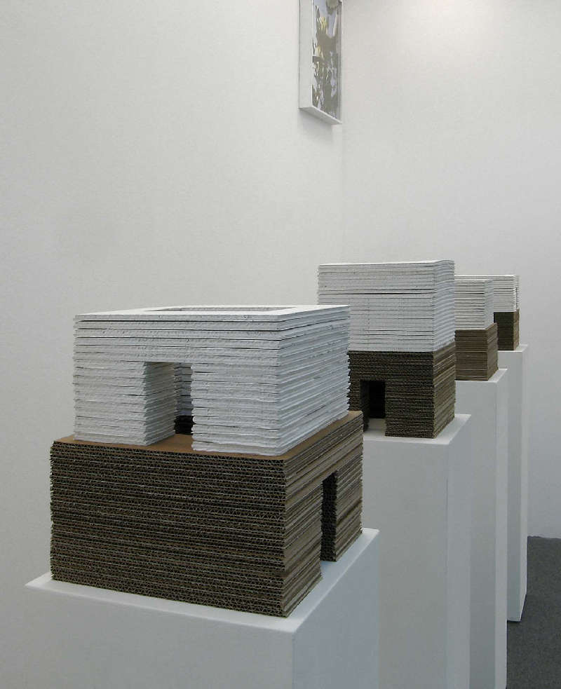 Può concentrarsi su una dimensione percorribile e abitabile, come nel caso della serie Observatorium, costituita da modelli architettonici realizzati con pile di cartone svuotate e dotate di fori per dialogare con l’esterno.