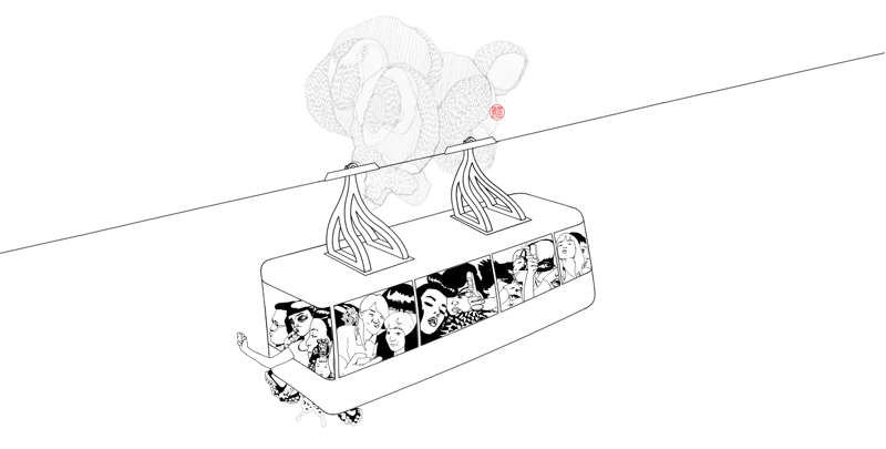 Pour son exposition Traversée et pour la première fois en France Élodie Dornand de Rouville a choisi d’extraire certains de ses croquis de leur contexte littéraire. En les retravaillant et les ré-assemblant sur du papier de mûrier traditionnel, elle se donne le temps de partager, avec nous, sa relation avec la Corée du Sud. Si la culture coréenne est parvenue à exporter internationalement son identité et sa culture, l’artiste nous en livre ici une vision distanciée, plus intime et sincère. Loin des clichés, Elodie nous entraîne de l’autre côté du miroir, mettant en scène avec humour les contradictions et paradoxes propre à la culture du pays du matin calme.