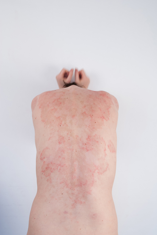 L’un de tes autoportraits, qui montre ton dos nu, surmonté de tes poings serrés, me fait quant à lui fortement penser à une sculpture, et aux autoportraits si monolithiques de John Coplans. Image forte d’une résistance à la maladie, un tel bloc compact de chair, synonyme de densité et de solidité, semble contrebalancer l’impermanence du corps. Coplans est-il pour toi une influence consciente ? Y en a- t-il d’autres ?...