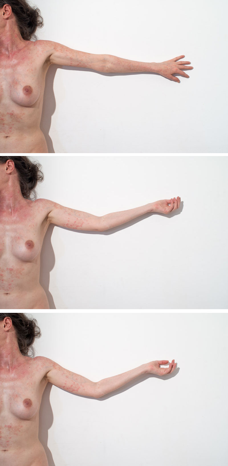 Entre cinéma et photographie, j’aimerais également citer Eadweard Muybridge et sa décomposition séquentielle du mouvement, à laquelle se réfère le triptyque montrant mon corps en mouvement, les bras levés.