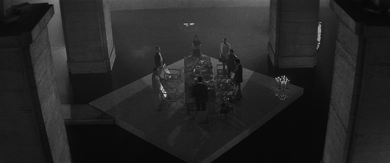 L’architecture sépulcrale de la scène du tombeau au début du film ramène à une épure totémique : plan fixe, économie de gestes, figure hiératique d’Ada (Mapi Galán), en longue cape blanche, composition structurée par l’équilibre des lignes et des contrastes, asymétrie corps humain/gisant en marbre, décors construits en dur par Jean-Vincent Puzos avec une mise en évidence des volumes et reliefs d’une solennité pyramidale. Contre toute vraisemblance, le corps d’Aldellio (Diogo Dória), semi-étendu sur les blocs de pierre, le tronc adossé à la tête du gisant, et non à l’intérieur du tombeau – ou pour le moins allongé comme est sensé l’être un mort – met en abyme diverses alternatives. La position oblique évoque celle d’un astronaute prêt au décollage. Bormane (Michel Albertini) n’a-t-il pas invité l’ingénieur à « quitter ce monde » en prenant une « capsule de mort-vivant » ? Le terme « capsule » revêt deux sens : enveloppe d’une potion (d’un poison comme le cyanure) et objet volant, d’autant que l’on apprend plus tard qu’Aldellio fut pilote en Libye et que la séquence suivante démarre sur les hélices d’un avion. Ou bien s’agit-il d’une des capsules temporelles chères à Andy Warhol (time capsules) ou encore d’une des « multiples capsules d’une nébuleuse photo-sémantique, visuelle, sonore, sub-vocale et tactile » que « William Seward Burroughs pilote simultanément » (F. J. Ossang, W.S. Burroughs vs formule-mort) ?