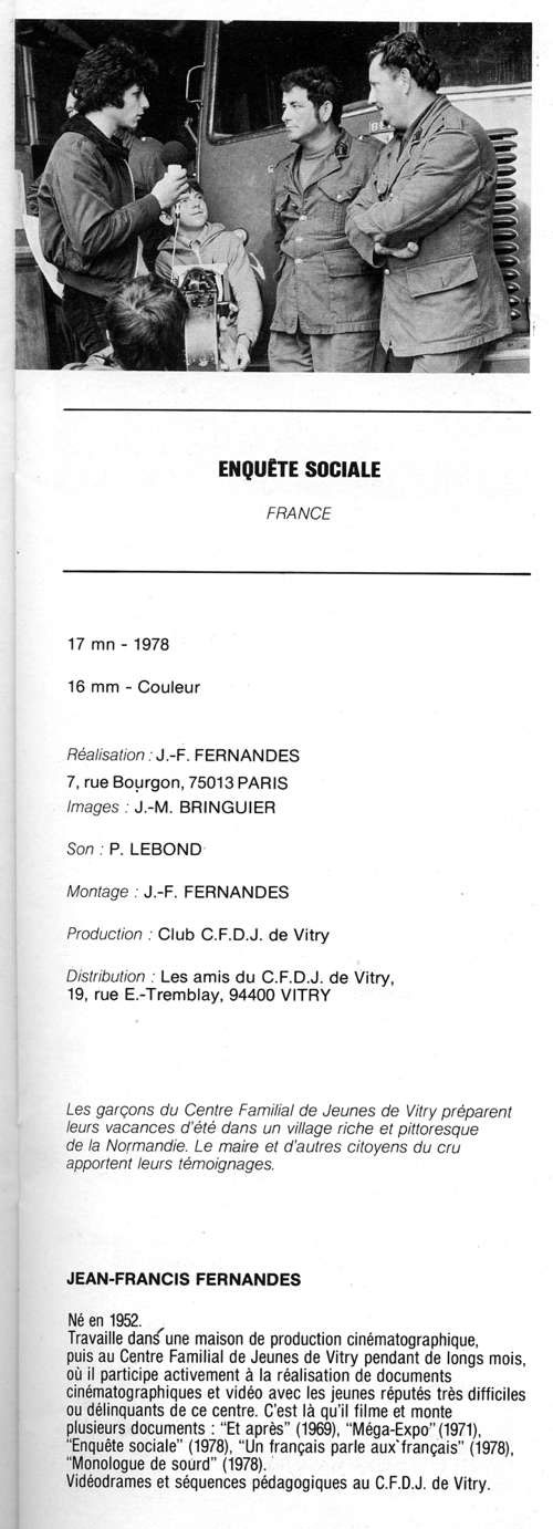 « Enquête Sociale » a été réalisé en 1978 à La Haye du Puits et sélectionné en 1980 pour le Festival International du film Ethnographique et Sociologique Cinéma du Réel au Centre Georges Pompidou.