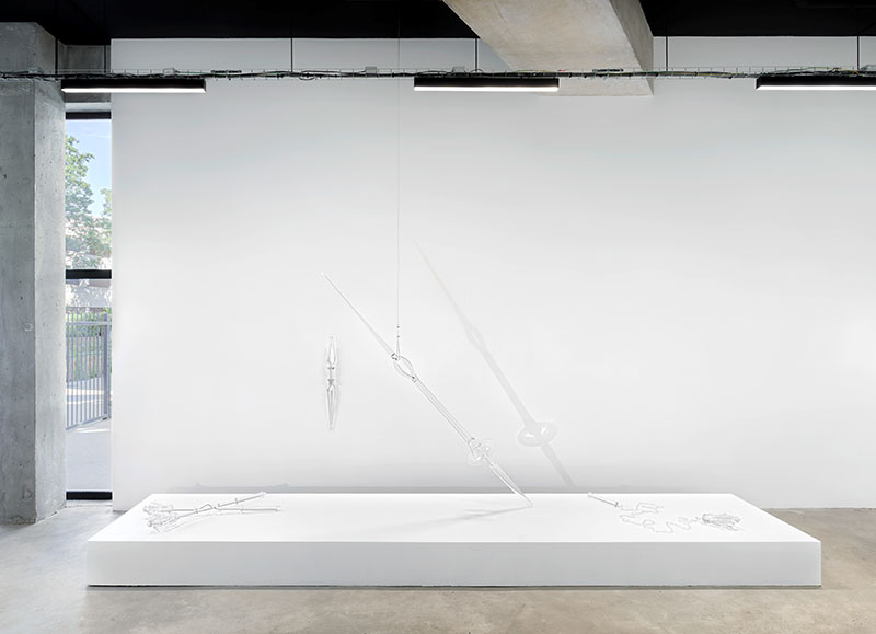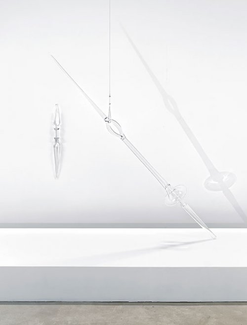 Mais si le soin – au sens médical – et prendre soin – de l’autre comme de soi-même – sont au centre des préoccupations de Floryan Varennes, c’est sans oublier la dimension de fragilité que recouvrent ces notions. La vulnérabilité précède en effet la cure et la protection, et les actions de (se) soigner comme de (se) protéger peuvent fléchir à tout instant si les conditions de leur réalisation ne sont pas réunies. L’artiste rend manifeste cette fragilité inhérente au care en utilisant des matériaux transparents comme le polymère et surtout le verre, qu’il emploie dans une série d’armes d’inspiration médiévale : Flirt, Assag, Fin’amore et Oblivion. Évocations d’une succession d’états amoureux, allant de la rencontre à la rupture, il rend ainsi compte de la force du sentiment qui vous assaille, vous transperce, vous écorche et vous assomme, mais aussi de sa précarité, le verre pouvant à tout moment être brisé comme le pourrait être un cœur.