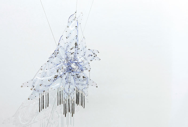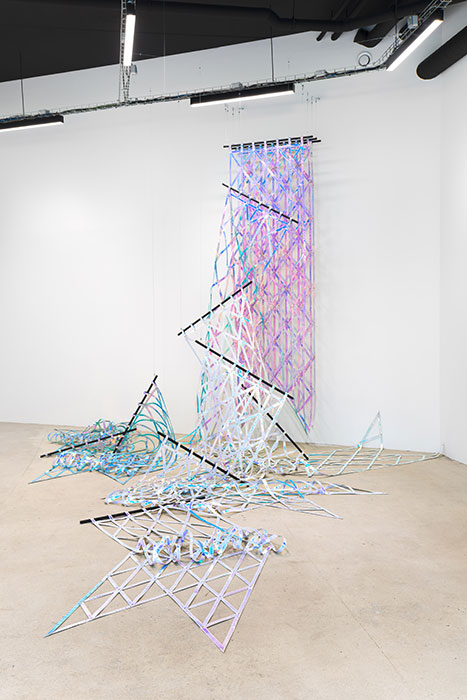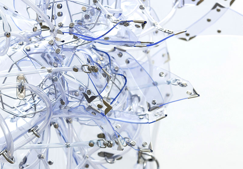 Renvoyant aux sens ou aux émotions, l’hypersensibilité fait référence à des états extrêmes du corps — qu’ils soient positifs ou négatifs —, une intensité retrouvée dans les œuvres de Floryan Varennes, faites de contrastes entre des matières, des formes et des concepts. Pour l’artiste qui a choisi de nommer Hypersensibilité sa première exposition personnelle à la Maëlle Galerie, cet état est surtout et avant tout une ouverture vers les autres, permise par une réceptivité exacerbée et mise au service de la compassion et de l’entraide. C’est ainsi que la Matriarche nous accueille dans l’exposition, entité futuriste en suspension dans l’espace, dont l’air menaçant n’a d’égal que son rôle tutélaire : assemblage de PVC et d’instruments médicaux, elle évoque aussi les formes d’une armure médiévale rivetée. Déesse du care, la Matriarche est à la fois curative et protectrice : elle veille sur nous.